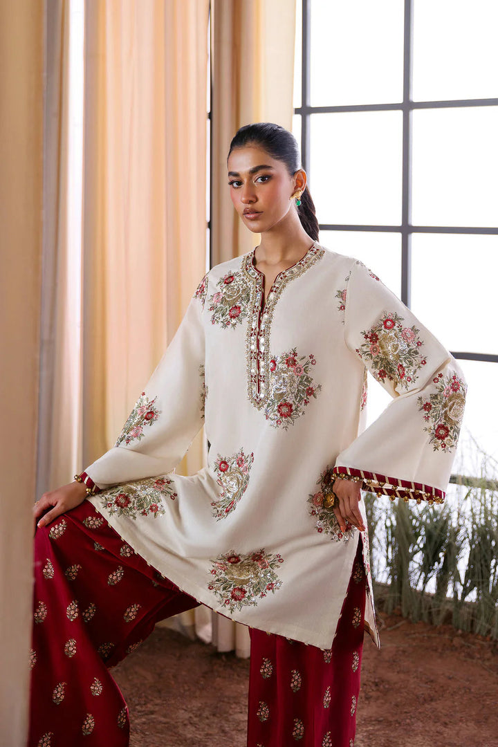 This stunning ensemble is a perfect blend of sophistication and style. The striking lemon ice off white shirt is enriched with vibrant embroidery, showcasing intricate floral motif designs and eye-catching accents with scintillating details. Paired with a classic embroidered shalwar portrayed in a contrasted deep maroon color, this outfit is a must-have for any festive occasion.