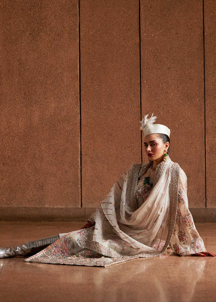 A perfect illustration of dazzling hues features stunning Ivory organza shirt with floral bunches embellished with intricate handwork details of sequins, resham, nakshi and dabka along with korean rawsilk choridar. Paired with a detailed embroidered organza duppata enhanced with intricate handwork details on four side border, setting a timeless appeal.