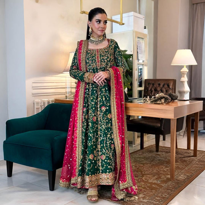 Step into timeless elegance with the Haris Shakeel Green with pink Embroidered Formal Dress. This breathtaking ensemble features a richly embroidered Green base adorned with intricate floral patterns in vibrant hues. The outfit is paired with a beautifully designed matching dupatta, bordered with fine embroidery that enhances its luxurious appeal. Perfect for weddings, evening soirées, or festive gatherings, this masterpiece embodies a seamless blend of tradition and contemporary sophistication. Crafted to perfection, Haris Shakeel's design ensures you stand out with grace and charm.