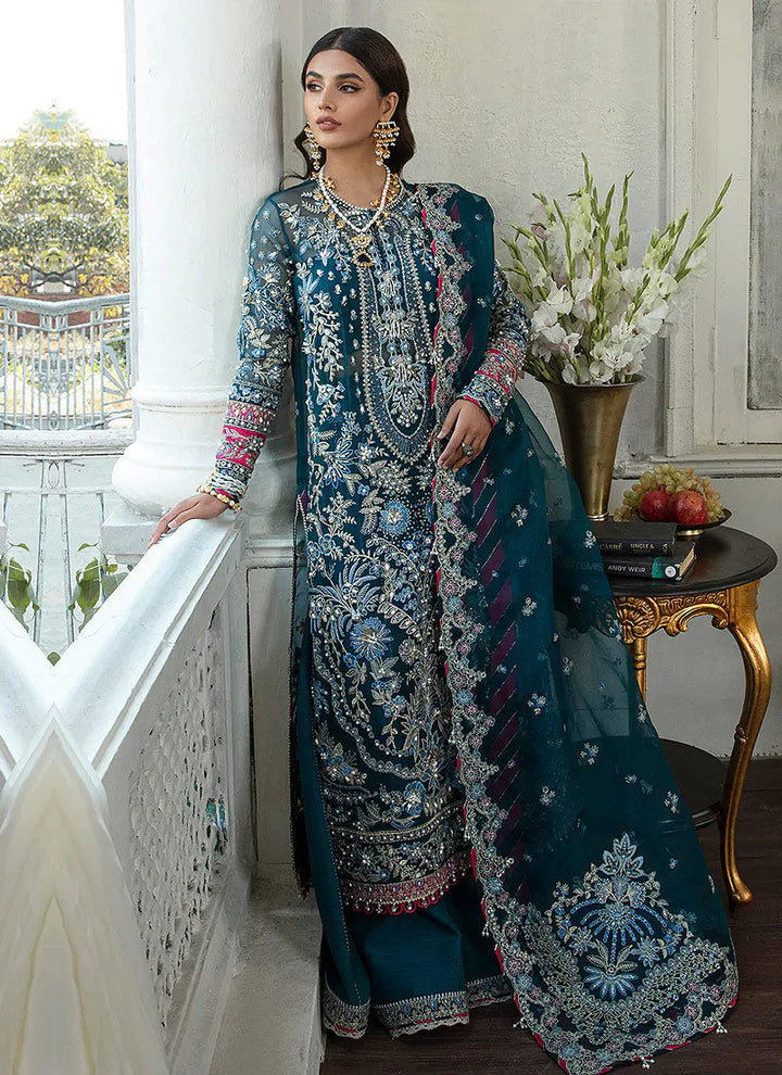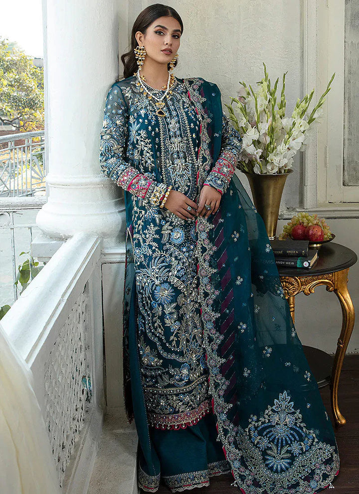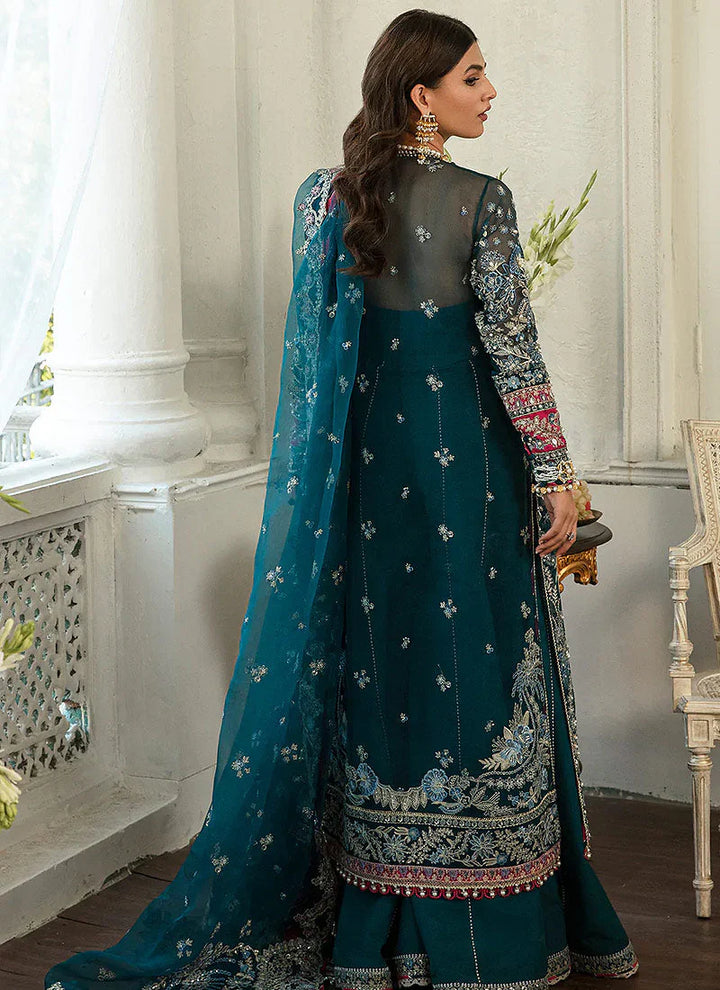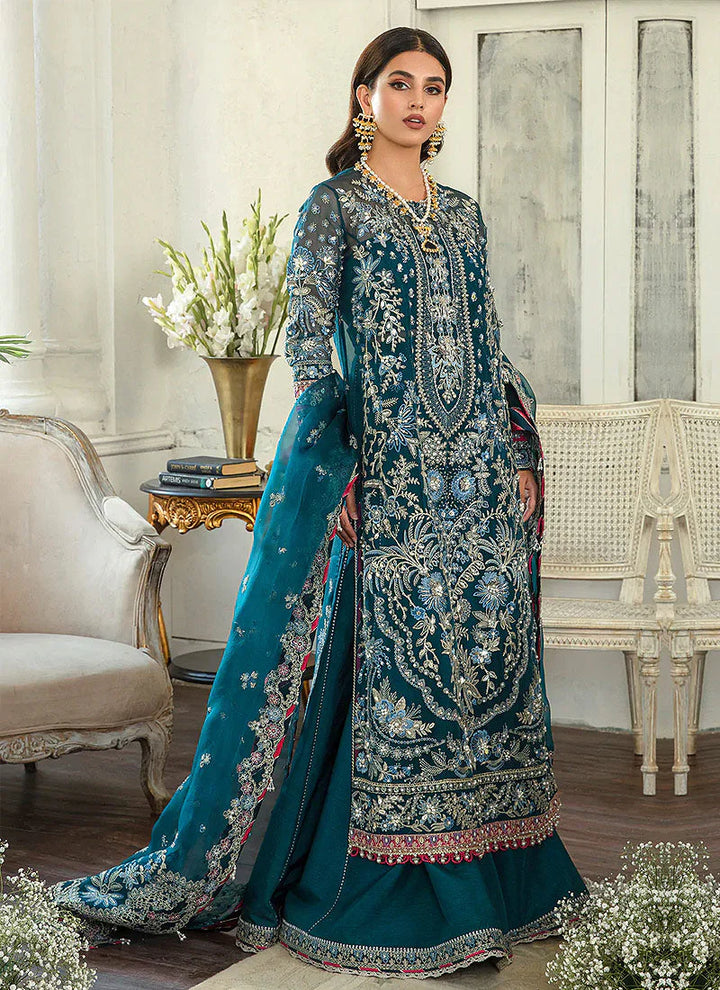 A vision of grandeur immersed in radiant teal opulence. Harmonizing a flared peplum with a luxuriously crushed sharara, the ensemble intertwines traditional regality with a dash of contemporary splendor. The diaphanous dupatta drifts like a silky musing, casting a spell of ineffable allure. Intricate handwork sheesha, resplendent 3D petals, and mesmerizing cutdana embroidery epitomize artisanal brilliance adding a couture finish to this charming look.