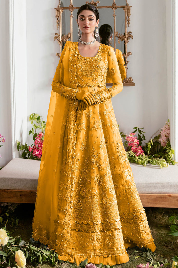 Exquisitely fashioned, 'Mirzeta' is an inspiring masterpiece, a canvas adorned with the artistry of seafoam, sage, and laguna hues, meticulously etched in intricate embroidery that graces every inch of the dress. The sheer fabric cascades gracefully to exude timeless and graceful femininity, complemented by a cinched waist. The ensemble is completed with an embelished organza dupatta and a peeking lehenga, elevating it to instant classic status with its timeless allure.