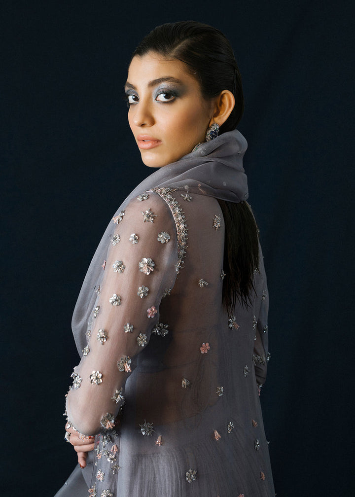 This grey epitome of grace is completely hand embellished. Featuring a key-hole neckline. Three dimensional floral embellishments donned with silver pipes, sequin, stones tastefully blended with grey and pink sequin and stone work. Paired with crushed silk sharara with embellished borders. Completing the look with sequin sprayed organza dupatta.